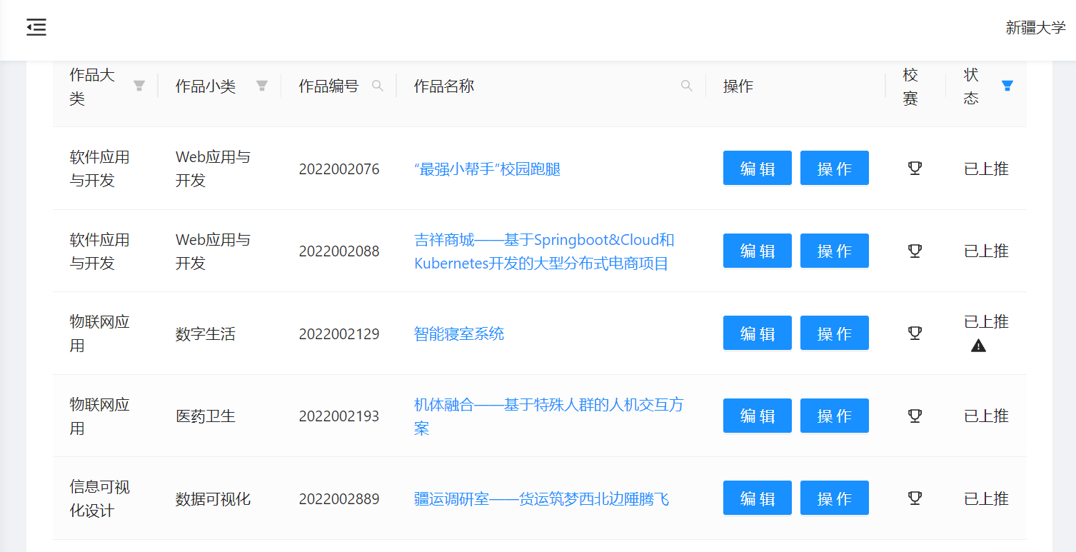 中国大学生计算机设计大赛由教育部高等学校计算机类专业教学指导委员会等委员会及机构联合主办,是新疆大学认定的一类大赛。大赛以校级赛——省级赛——国家级赛三级竞赛形式开展,本年度新疆区级赛经新疆维吾尔自治区教育厅审批,由新疆维吾尔自治区高校计算机教育学会主办,新疆大学信息科学与工程学院(网络空间安全学院、计算与数据中心)承办。在教务处及学院领导的大力支持下,学院协同创新办公室积极、认真、严谨、有序的开展了本次比赛的组织工作,共收集参赛作品81项,涵盖11大类21个小类。经校内选拔,共推荐68件作品省参加区赛,最终有49项作品获奖,涵盖软件应用与开发、物联网应用、人工智能等10个类型,在参赛人数、参赛类型、获奖数量上都比往年有很大的提高。